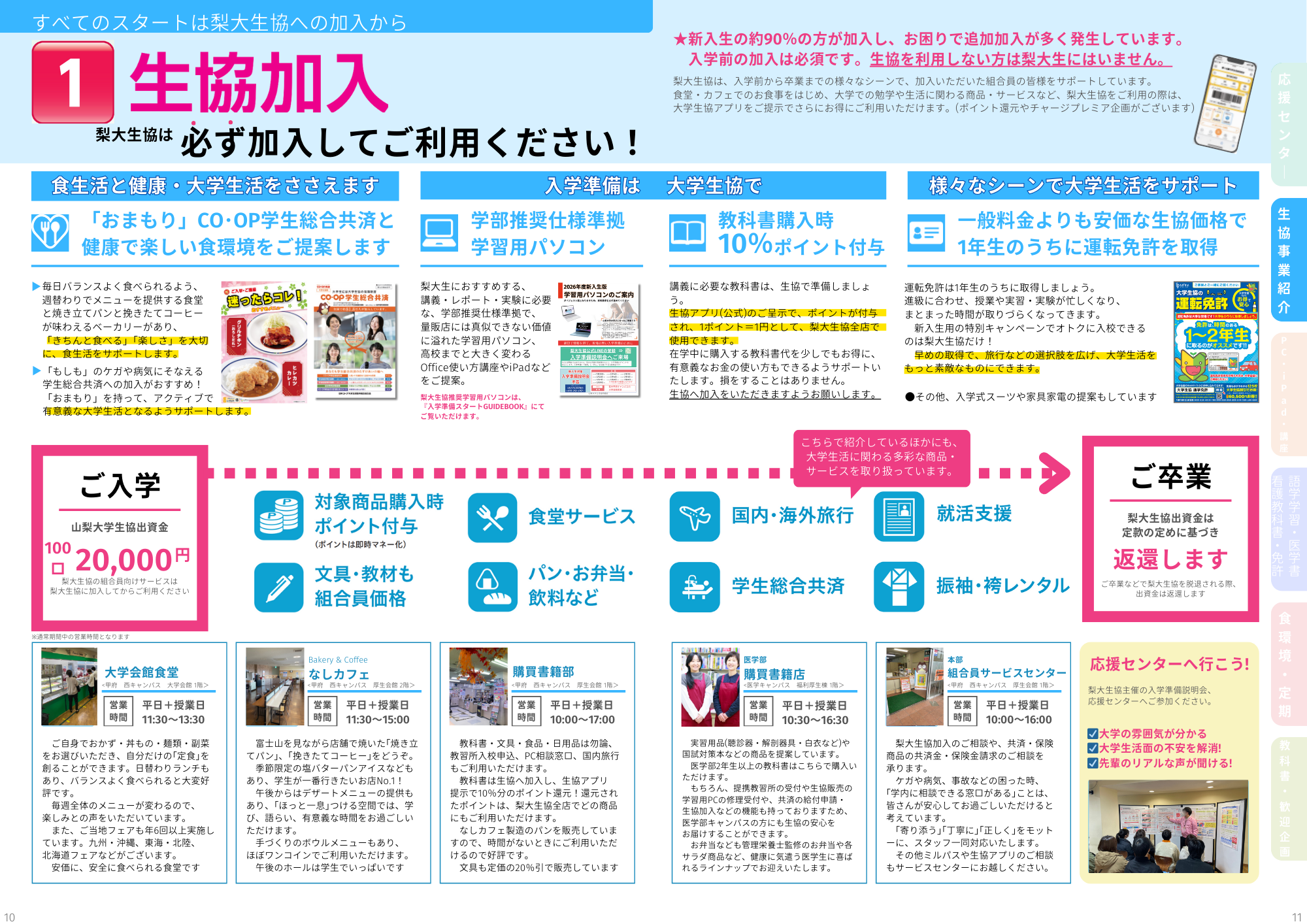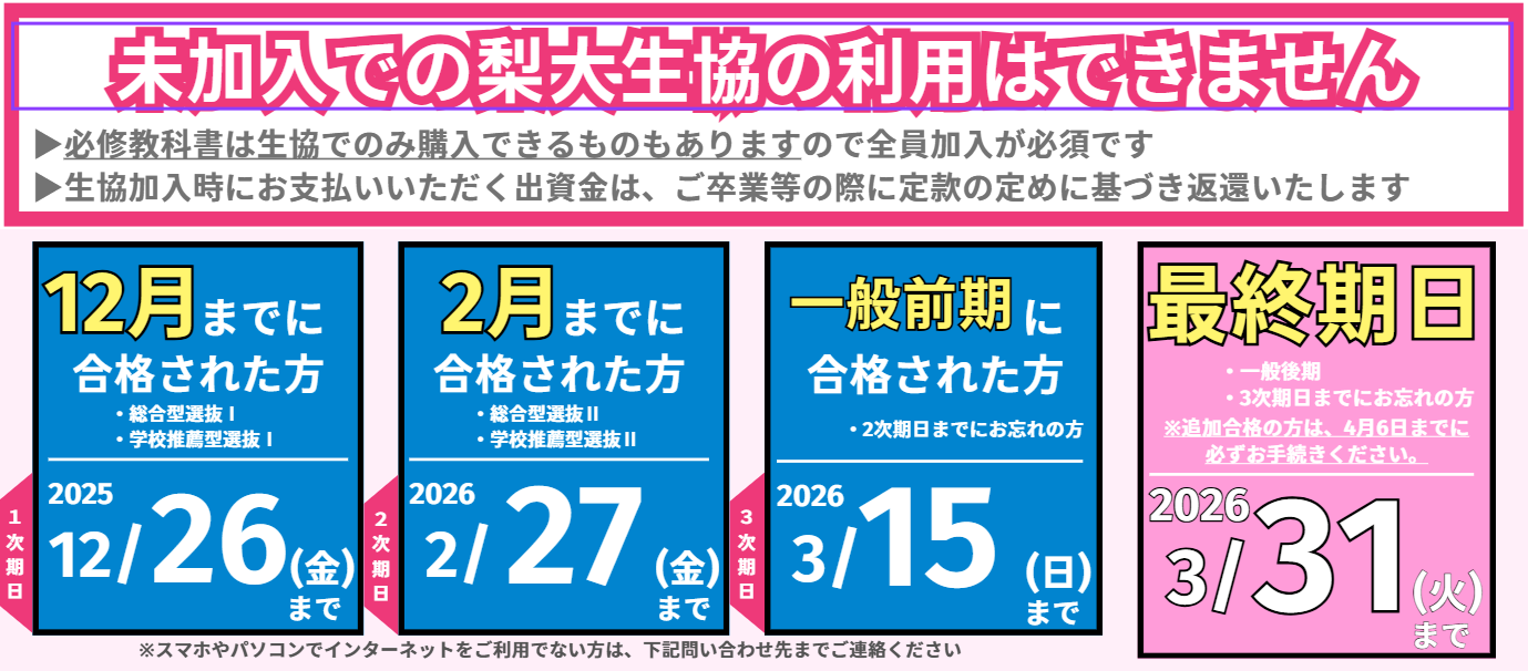 - 山梨大学生活協同組合は、山梨大学の学生・教職員の出資金で運営されています。学内にある生協のお店をご利用いただくにあたっては、梨大生協の組合員になっていただくことが「消費生活協同組合法」により定められています。