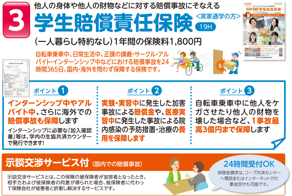 - 日常生活も、正課の講義も、インターンシップも、賠償事故を幅広くフォローできる保険です