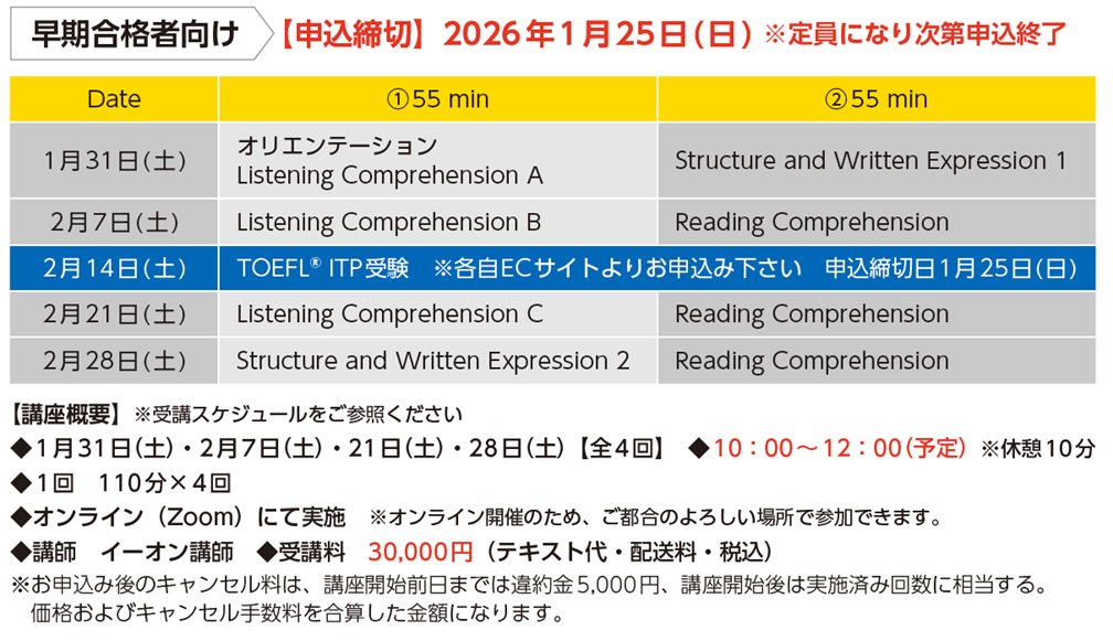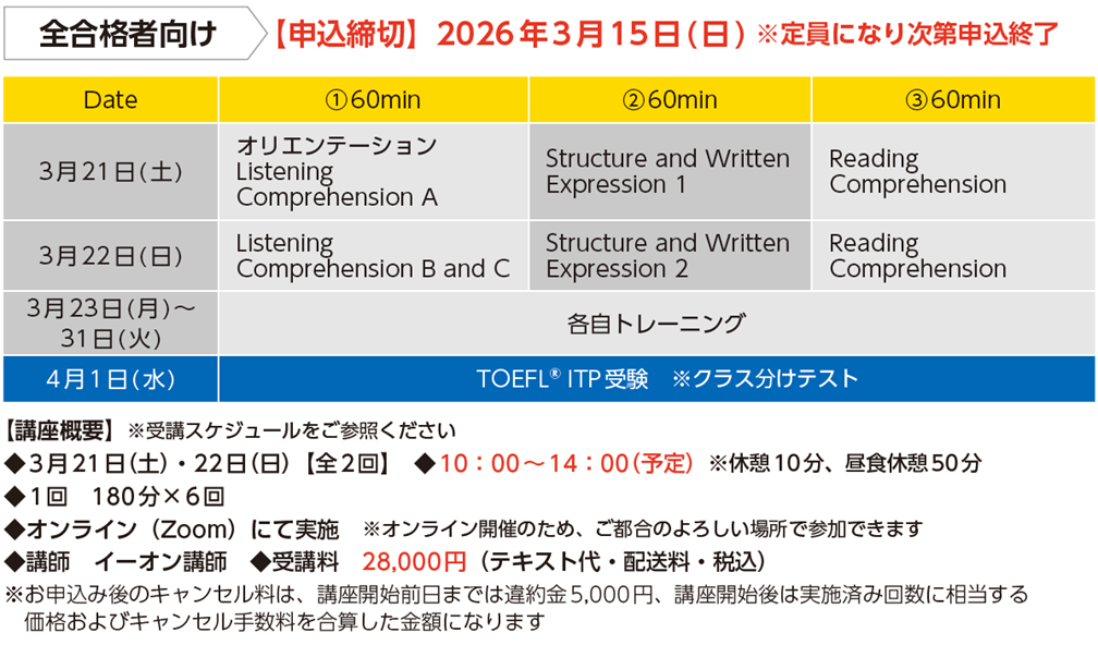 2月にTOEFL試験を受験した時は、時間が足りず結構難しいなという印象を受けました。試験の説明もすべて英語だったので驚きました。思っていたよりもリスニングが解けていて文法問題ができていなかったので、2月の受験の後にはスターターキットを使って文法問題対策にも取り組みました。4月のTOEFL試験の受験時には、2月の受験時よりも解くスピードがあがった実感がありました。リスニングでは、最初の簡単な問題は確実に取れるようにしました。問題を読むスピードが早くなったので文法問題の見直しにも余裕がありました。正直受かっている自信はありませんでしたが、無事に500点を超えることができその後はデータサイエンス学部の専門授業に力を注ぐことができました。500点を越えなかった僕の友達はPEの課題に追われていて大変そうでした。<早期合格者より>
