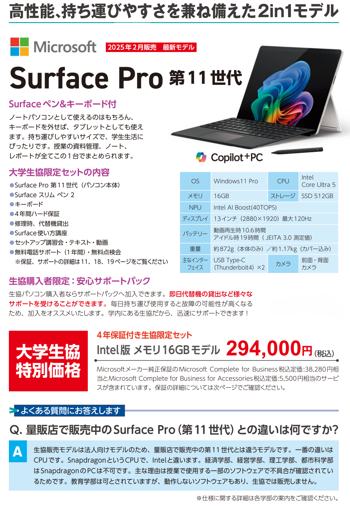 量販店で販売中のSurface Pro(第11世代)はCPUが違うもので、授業で使うソフトの1部で正常に動かないことが確認されています。そのためSurfaceを買うなら生協がおすすめです。