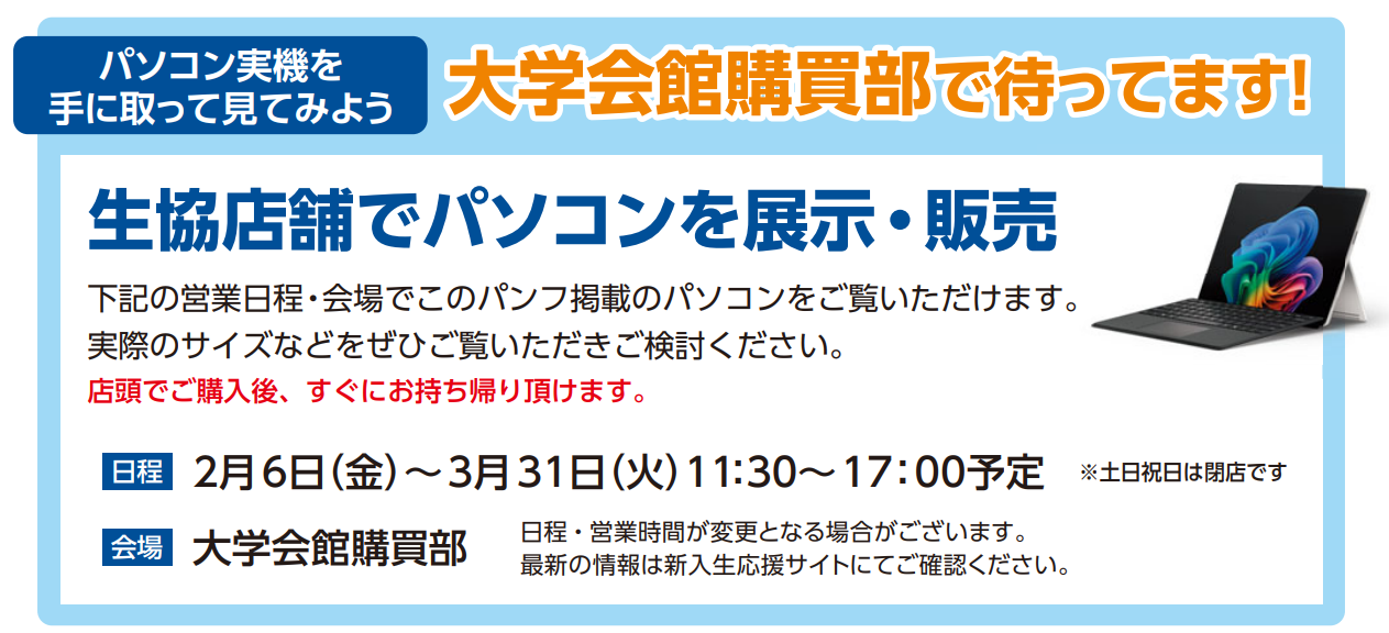 本日よりパソコンの販売を開始しました。 早めに確保していたため、12月頃から始まった急激なPC価格上昇の影響は受けていません。 前年と同程度確保していますが数量限定となりますため、合格者が多い3月には売り切れが発生する可能性がございます。 通販サイトはこちら 店舗でも販売しています。