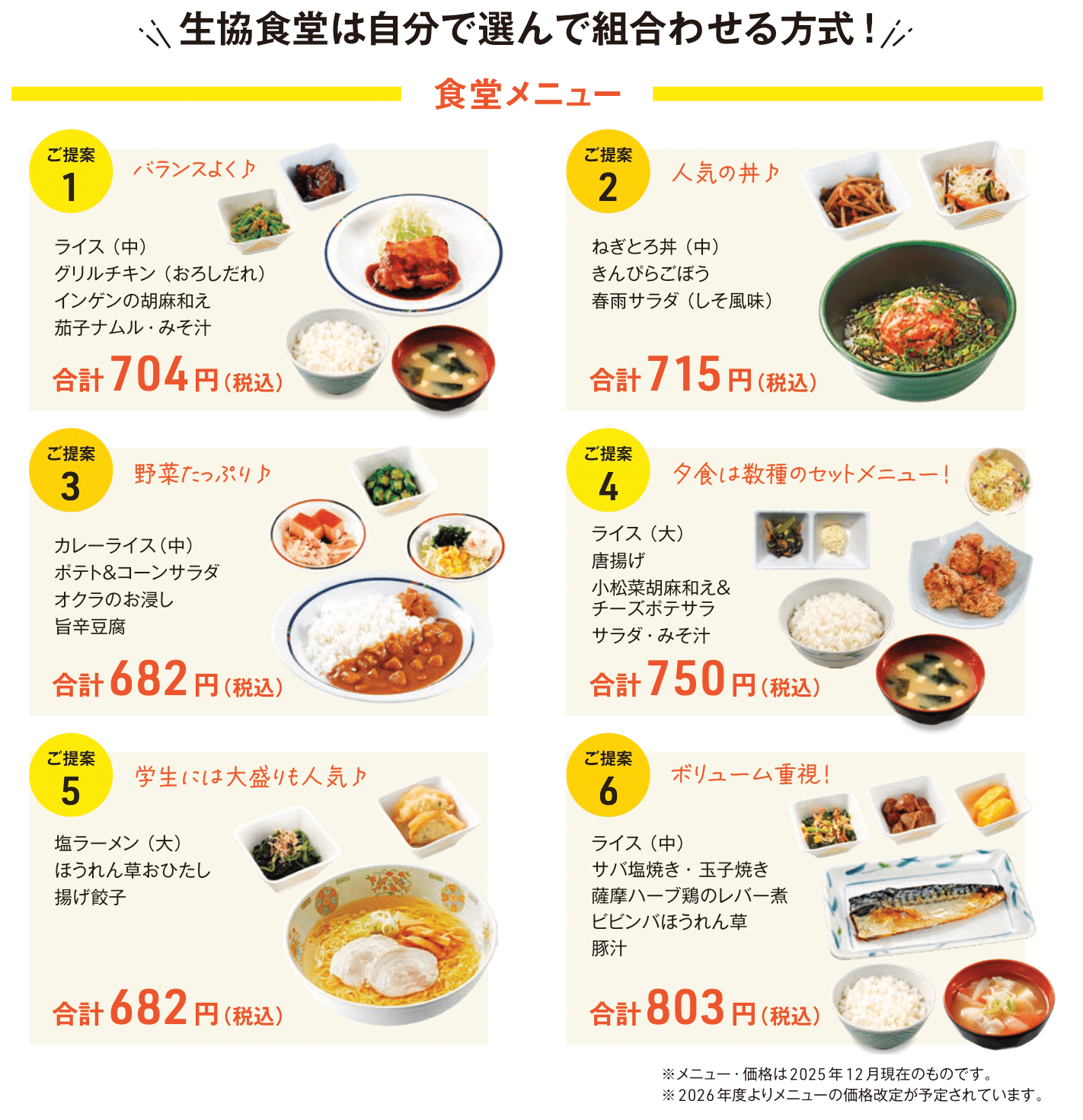食費を削らず生協食堂できちんとバランスの良い食事ができます。1日の未使用額分の繰り越しが出来ないので、毎日きちんと食べる習慣が身につきます。