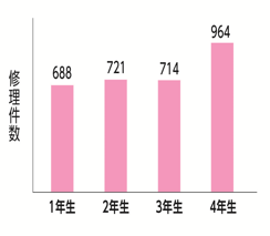 パソコン自然故障箇所は、主に記憶装置、キーボード、液晶ディスプレイなどが挙げられますが、グラフが示すように使用年数に応じて件数が増加します。高学年になるほどパソコンの使用頻度や重要性が高まるため、自然故障に対する修理が4年間無償で受けられることは、大きな安心材料といえます。