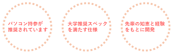 高校生活でも行ってきたインターネットを活用して情報や文献(論文)を調べながらの学習機会は確実に増えます。さらに、動画コンテンツの視聴による予習・復習、グループワークによる資料共有、演習の事前・事後課題、実習の報告書など、様々な課題をパソコンを使って行います。授業以外でもサークル活動や就職準備など、様々な機会でパソコンを活用します。自由な時間に利用でき、データの管理も行いやすい自分専用のパソコンを持つことをお勧めします。パソコンを使用する場所は自宅とは限りませんので、故障や破損時の保障を充実させておくことをお勧めします。