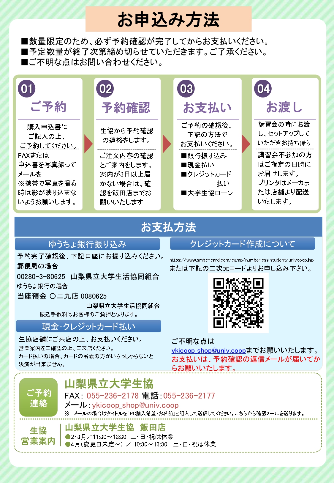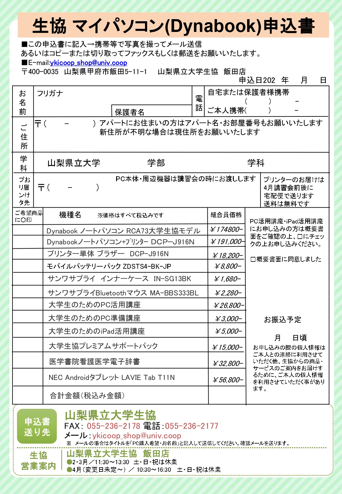 山梨県立大学生協では、オリジナルパソコン“大学生協モデル”を取り扱っています。