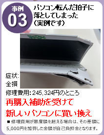 大事に扱っているつもりでも、誰にでも「ついうっかり」ということはあります。キーボードの上に飲み物をこぼす、机から落としてしまう、知らずにペンなどの異物を挟んでパソコンを閉じてしまう、といった不注意による事故は後を絶ちません。こうした故障や破損、さらには盗難を卒業までの4年間カバーするのが動産保障です。5,000円からの低額な自己負担金で修理が受けられ、修理不能の場合は再購入の補助も用意されています。