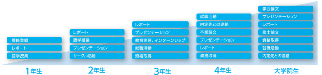 レポートなどの課題に取り組む際は必須 ・通常の授業で使用することもある。